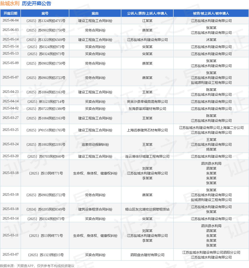 本站消息,根据天眼查APP显示,近日公布了一则江苏盐城水利建设有限公司作为被告/被上诉人的开庭公告,详细内容如下: